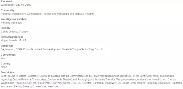 这次Segway牵头在ITC发起Complaints,但是案件目前还没有被ITC受理,不过问题不大,下周应该就会被受理了。
