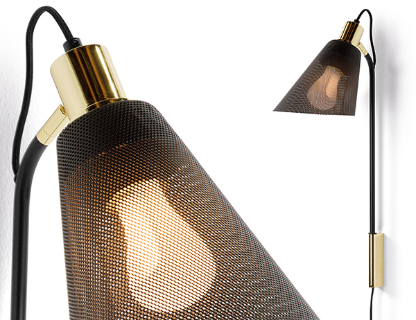 该系列灯具包括壁灯、吊灯和台灯等,Plumen 002 LED 灯泡外加金属网纱灯罩构成这款复古灯具。昏黄的灯光从网纱空隙中散发开来,向周围空间中照射,从而营造出朦胧的感觉。抛光的黄铜部件与黑色网纱搭配十分典雅。