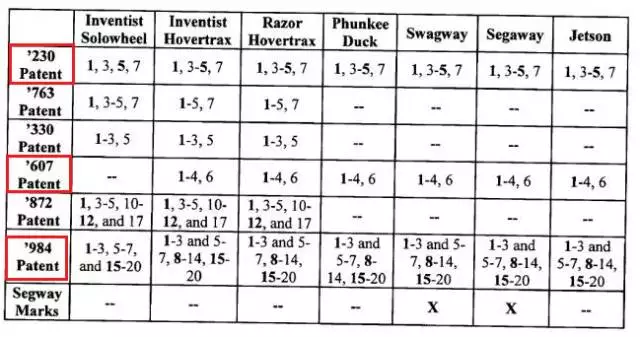 涉案的专利分别是US 6,302,230、US 7,275,607和US 9,188,984,这三个专利属于Segway在上个月的ITC的337调查中用到专利的一部分。